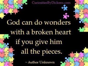 Driving home the other day I caught a glimpse of the pain God feels for us as my heart literally broke for someone I did not even know. At a stoplight, I watched a young lady in front of me weeping uncontrollably. Immediately, I began to feel the pain in her tears as I began to cry. While I interceded on her behalf, I could only hope that she had a relationship with the Father and that He would reach down into her life and comfort her in this time of despair. Even though I had no idea what was going on in her life and that there was no way I personally could fix anything; I knew the One who could. His name was Jehovah Shalom; the God of peace, his name was Jehovah Jireh, the God who provides. The God we serve is the Great I Am and no problem or trial we ever face is too big for him. I cannot even fathom how much his heart breaks for all of us because seeing one person in anguish who I didn’t even know brought me to tears. He holds the whole world in His hands and one day soon He will wipe ever tear away from our eyes and death shall be no more, there will be no more heartache or pain and all we will know is joy and peace. I don’t know about you, but I cannot wait for that day, but until then I will put my hope and trust in the Lord!
