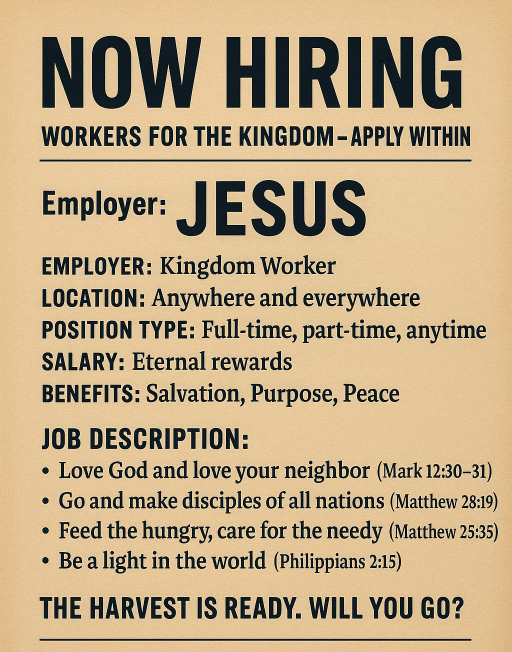 Have you seen the latest job posting? It’s not on LinkedIn or Indeed, and you won’t find it listed in the classifieds. But the Employer is the most powerful, loving, and trustworthy Being you’ll ever serve under. He doesn’t require an advanced degree or a resume full of accolades. He’s simply looking for hearts willing to love, hands ready to serve, and voices willing to proclaim. Jesus is hiring—and the position is open now.