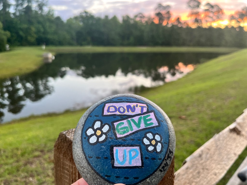Right there on the fence point, slightly illuminated by the flicker of my headlamp, was a decorative rock. On it, in bold, simple letters, were three powerful words: Don’t Give Up.