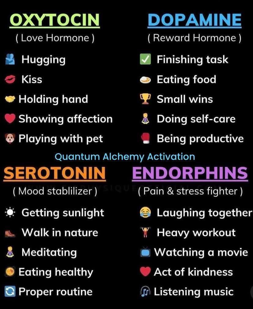 God didn’t just give us Scripture to feed our souls; He also designed our bodies to help us heal. I recently came across this powerful graphic showing four major “happy hormones” God built into us: Oxytocin, Dopamine, Serotonin, and Endorphins.